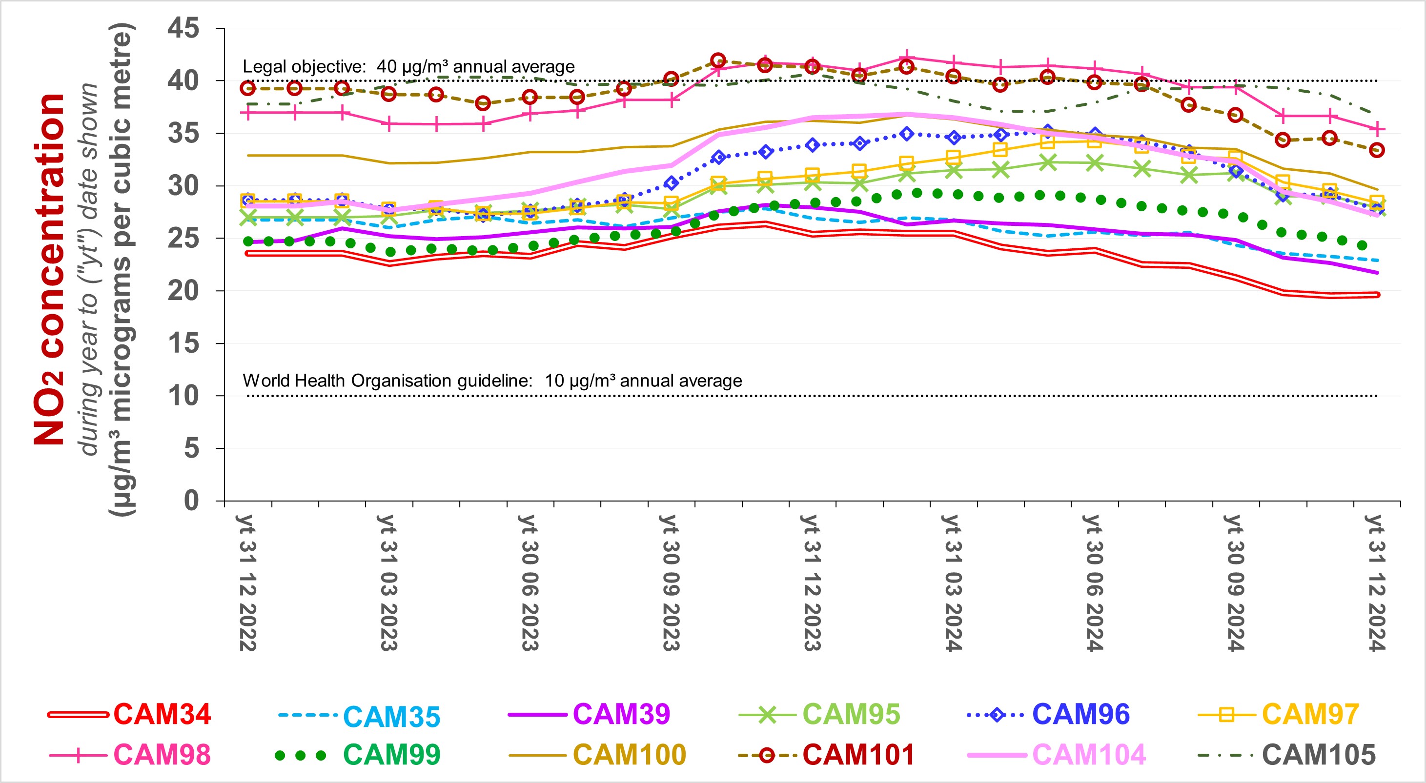 The following charts illustrate trends in the annual average concentration of NO2, PM10 and PM2.5 as recorded in Camden by reference quality monitors.