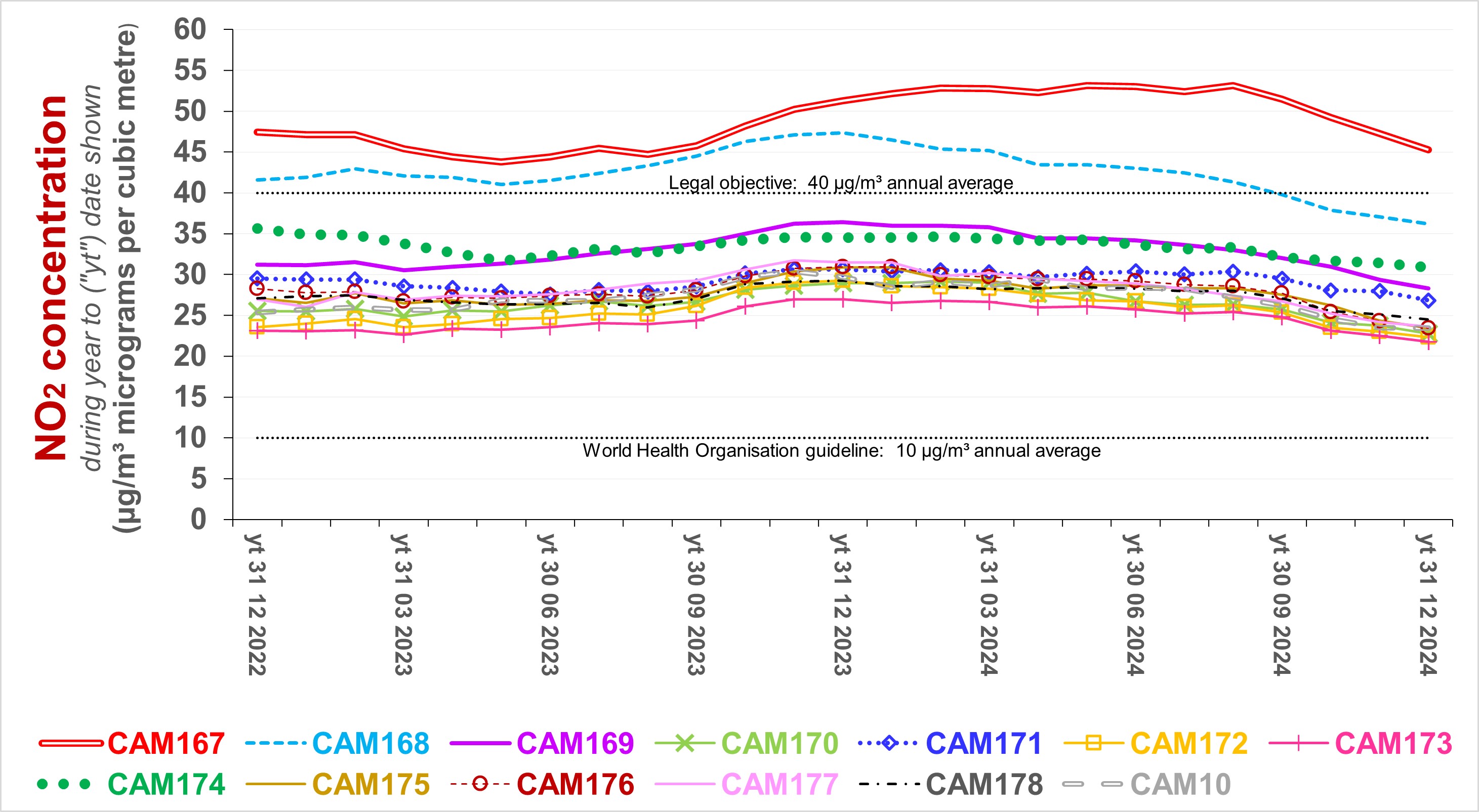 The following three charts illustrate trends in concentrations for successive periods of 12 months at selected locations, as measured (presented without adjustment for bias), based on Annual Status Reports: