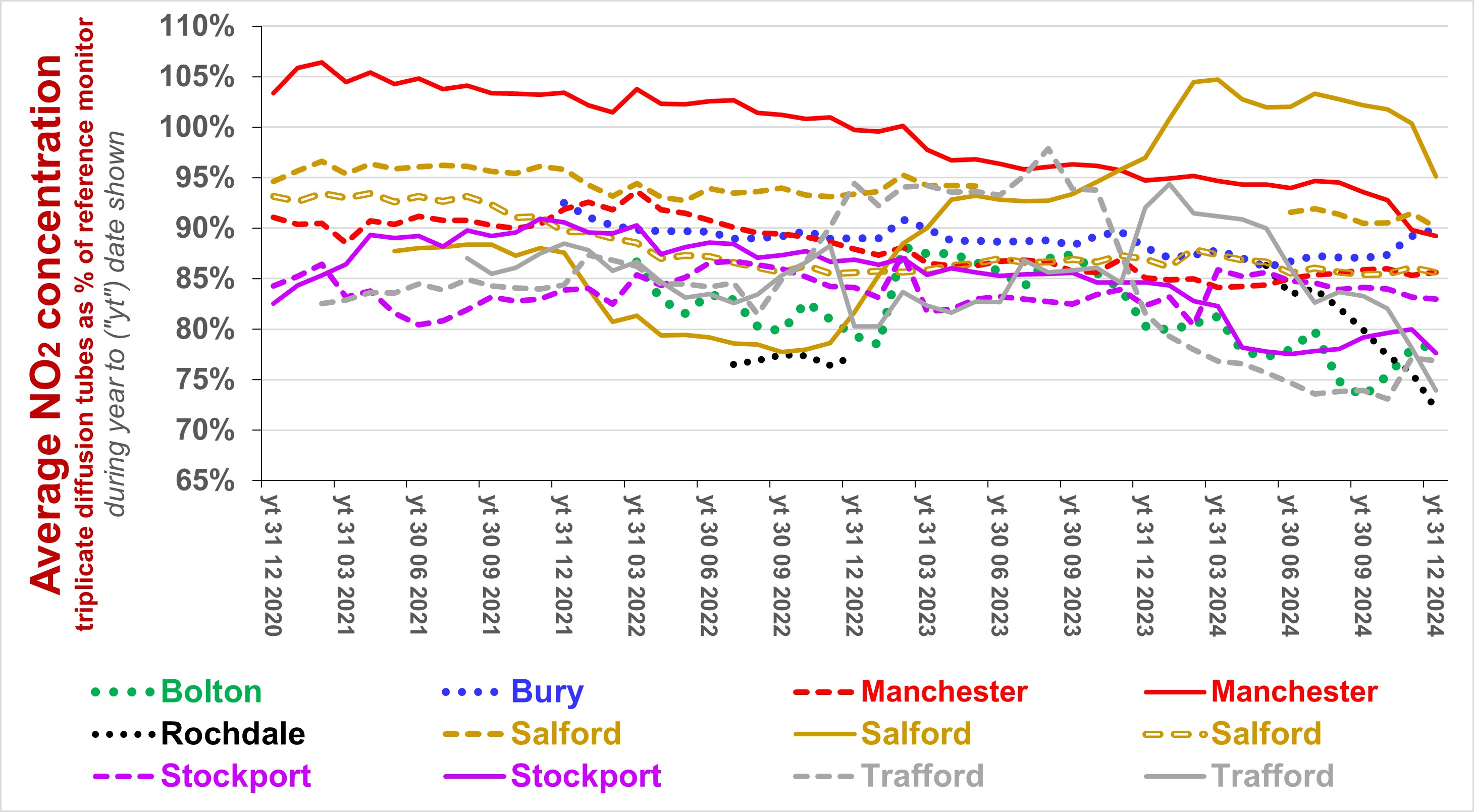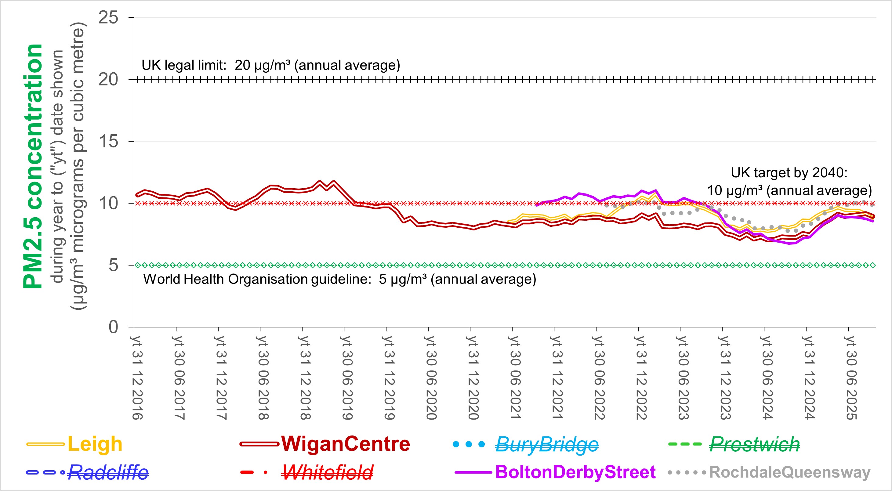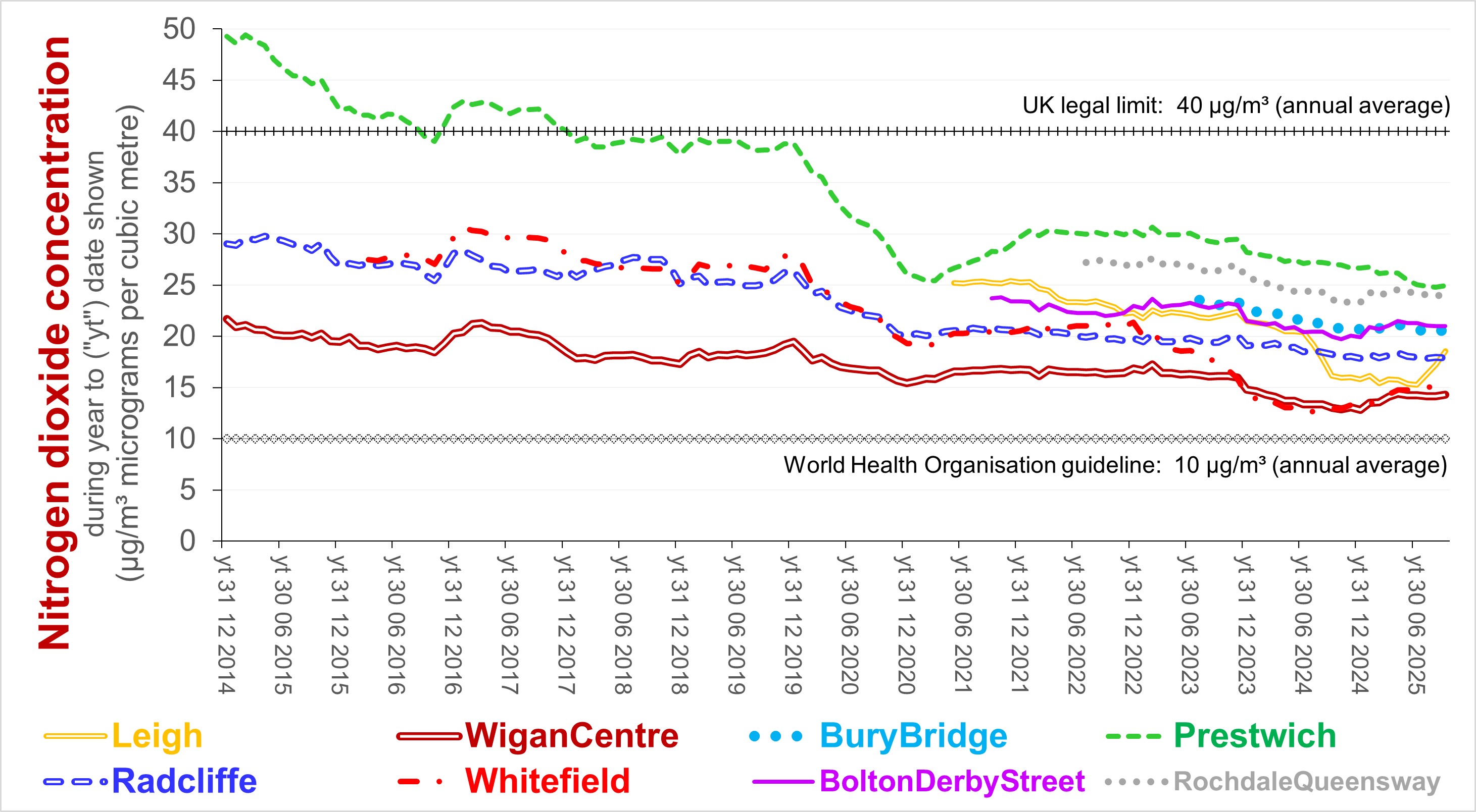 The following charts show how the average 12-monthly concentrations of nitrogen dioxidxe (NO2) and particulate matter (PM10 and PM2.5) have changed since 2010 at sites measured for regulatory purposes in the City of Manchester and neighbouring areas as reported by Air Quality England (data up to 30/09/2025; most sites ratified up to 31/03/2025).