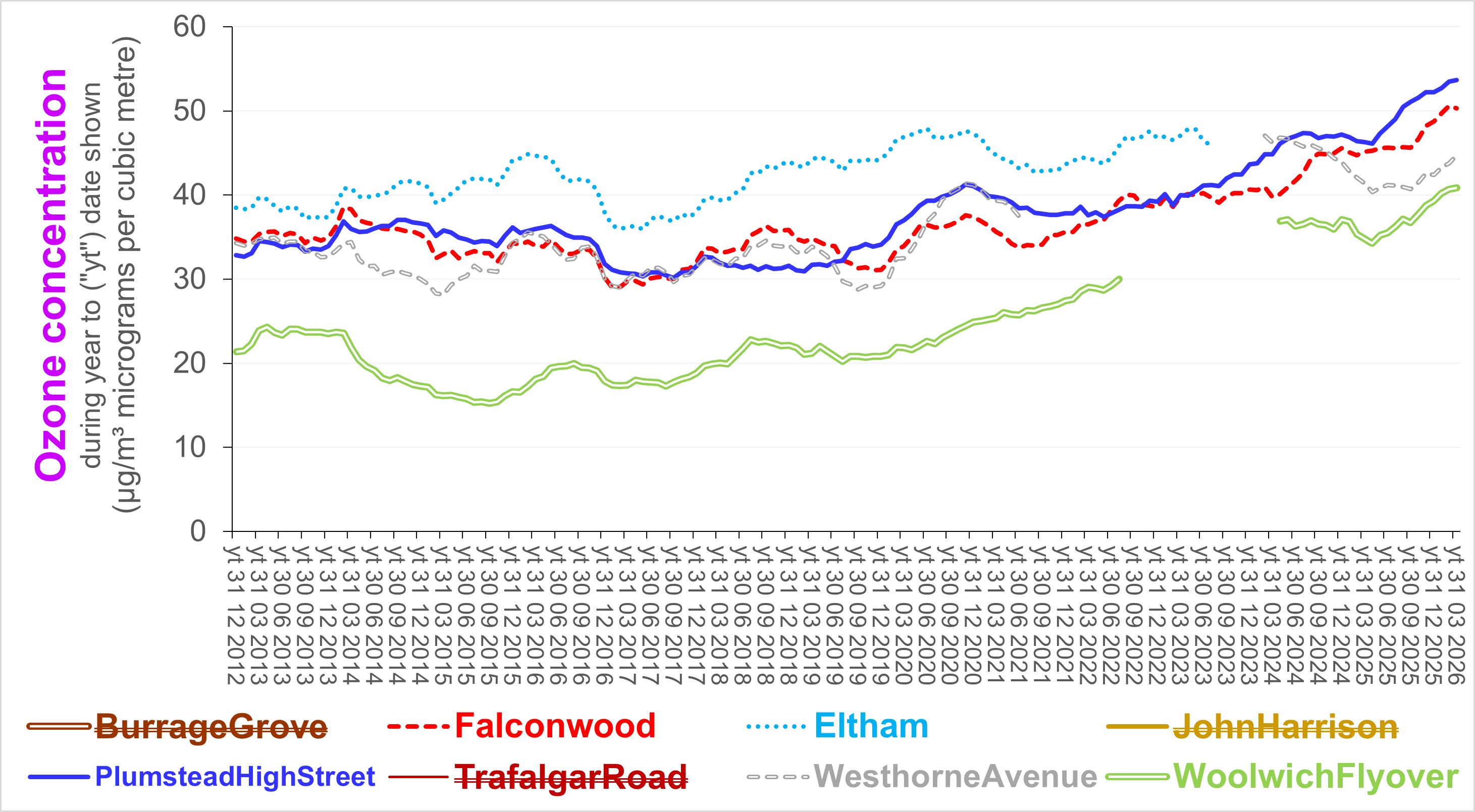 The following charts illustrate changes in the annual average concentration of four air pollutants which have occured since 2012. The measurements reflect conditions in the immediate vicinity of the monitoring site rather than in the named locality. The measurements for 2022 have yet to be fully ratified. They are based on London Air.