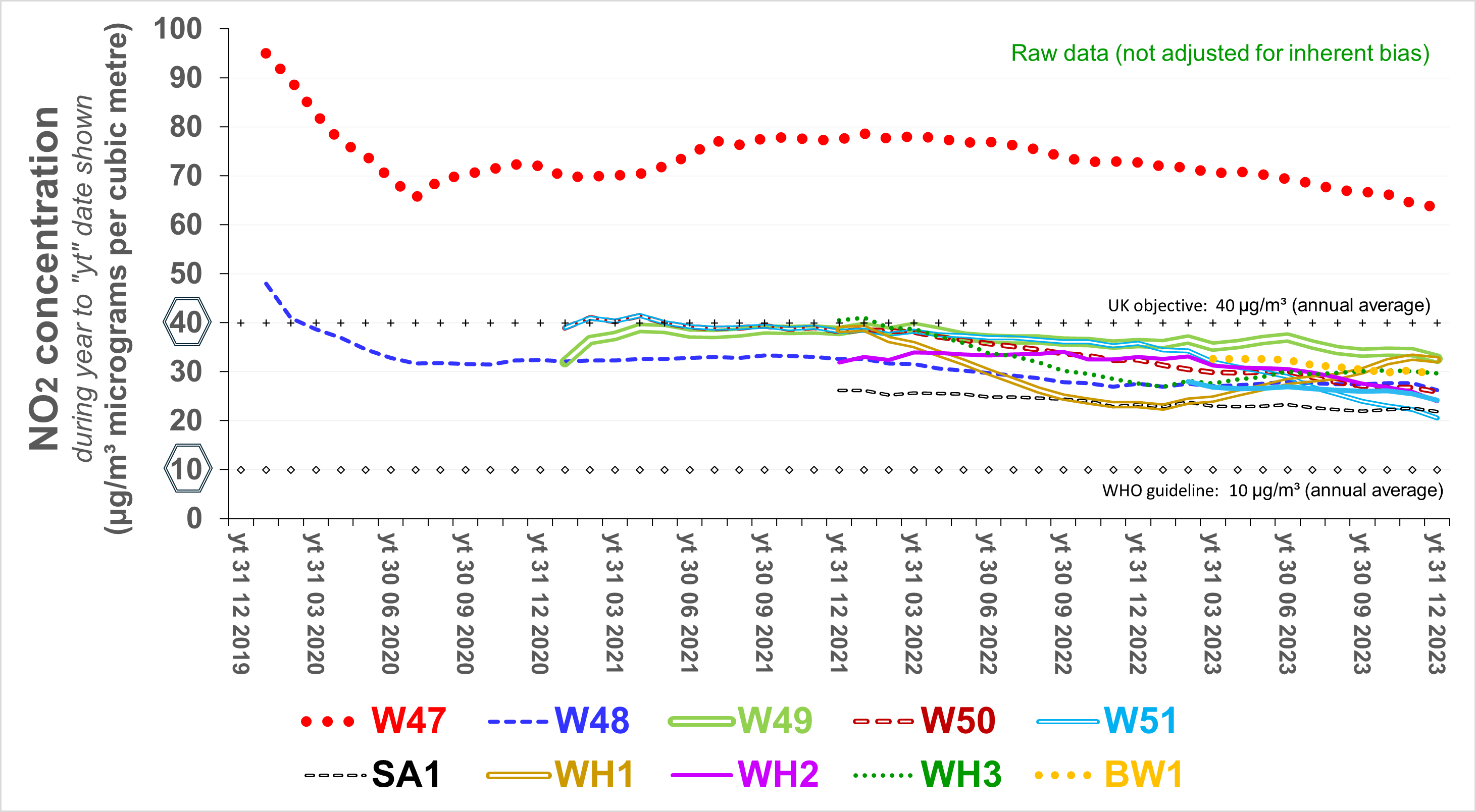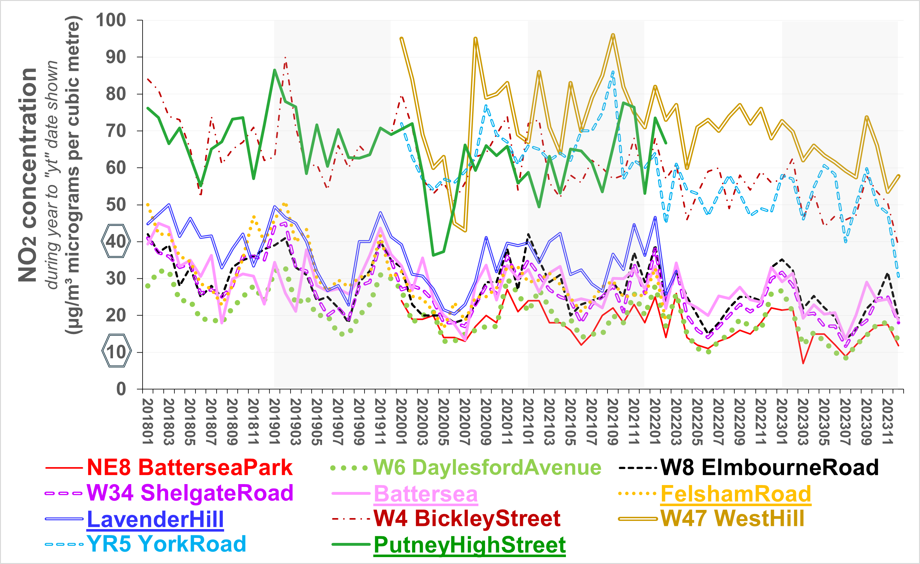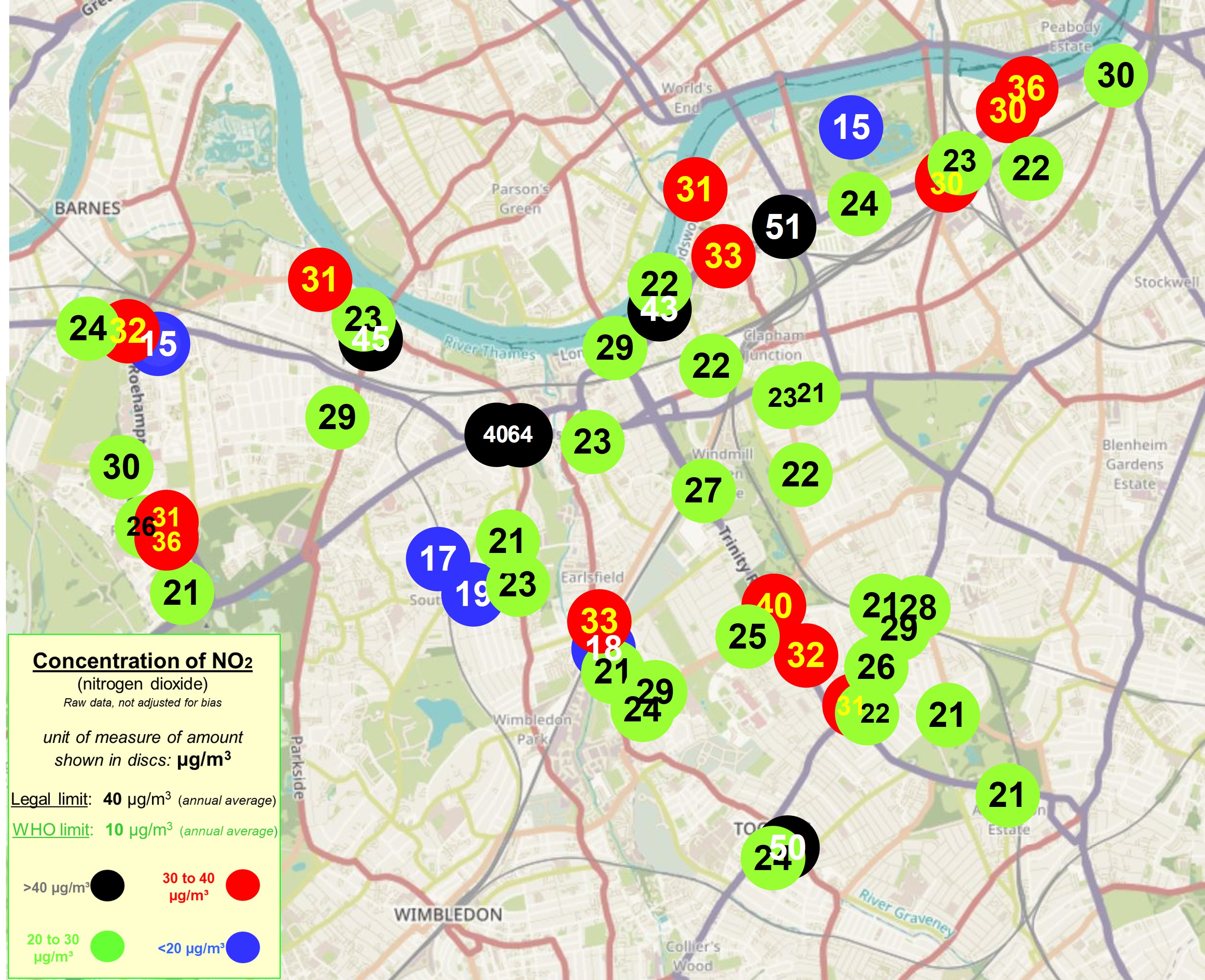 Despite being close to heavily trafficked roads, concentrations at the Batterssea, Felsham Road and Lavender Hill reference monitor sites are similar to those where concentraions are lowest. This reflects that NO2 concentrations decline rapidly with distance away from hotspots. Concentrations at the rear of buildings adjacent hotspots will also tend to be lower than in the front. Concentrations inside vehicles on busy roads are much greater than when eating or drinking "al fresco" at the roadside. The owners of those cafes might generate more business (GDP) by successful advocacy for clean air. Jogging along busy roads likewise tends to maximise one's exposure to air pollution (but the benefits from physical exercise may more than compensate for the harm caused by the pollution) Concentrations vary vertically. Adjacent busy roads, they are likely to be greatest near the height of children in buggies. (Horizontally, if the measurement - for NO2 - is made 0.5m away from the kerb and the concentration measured is 35 while that in the background locally is 15, then the concentration in a vehicle being driven on the road is likely to be 40. It would be 30 two long paces further away, and 25 six metres beyond that.)