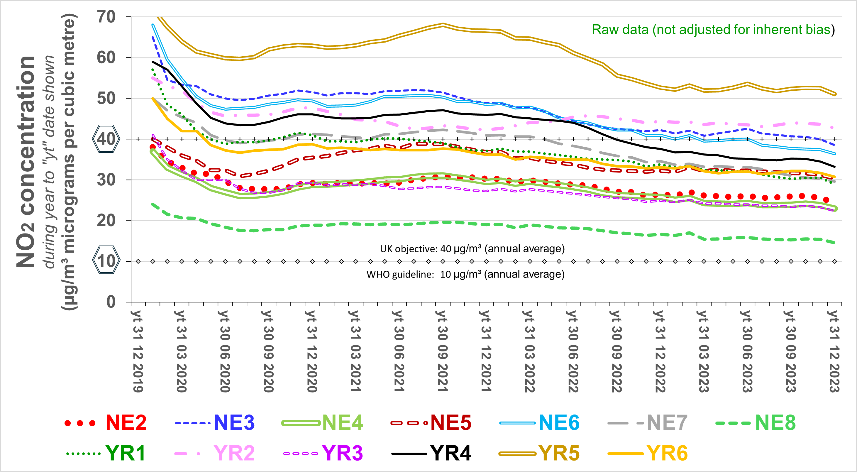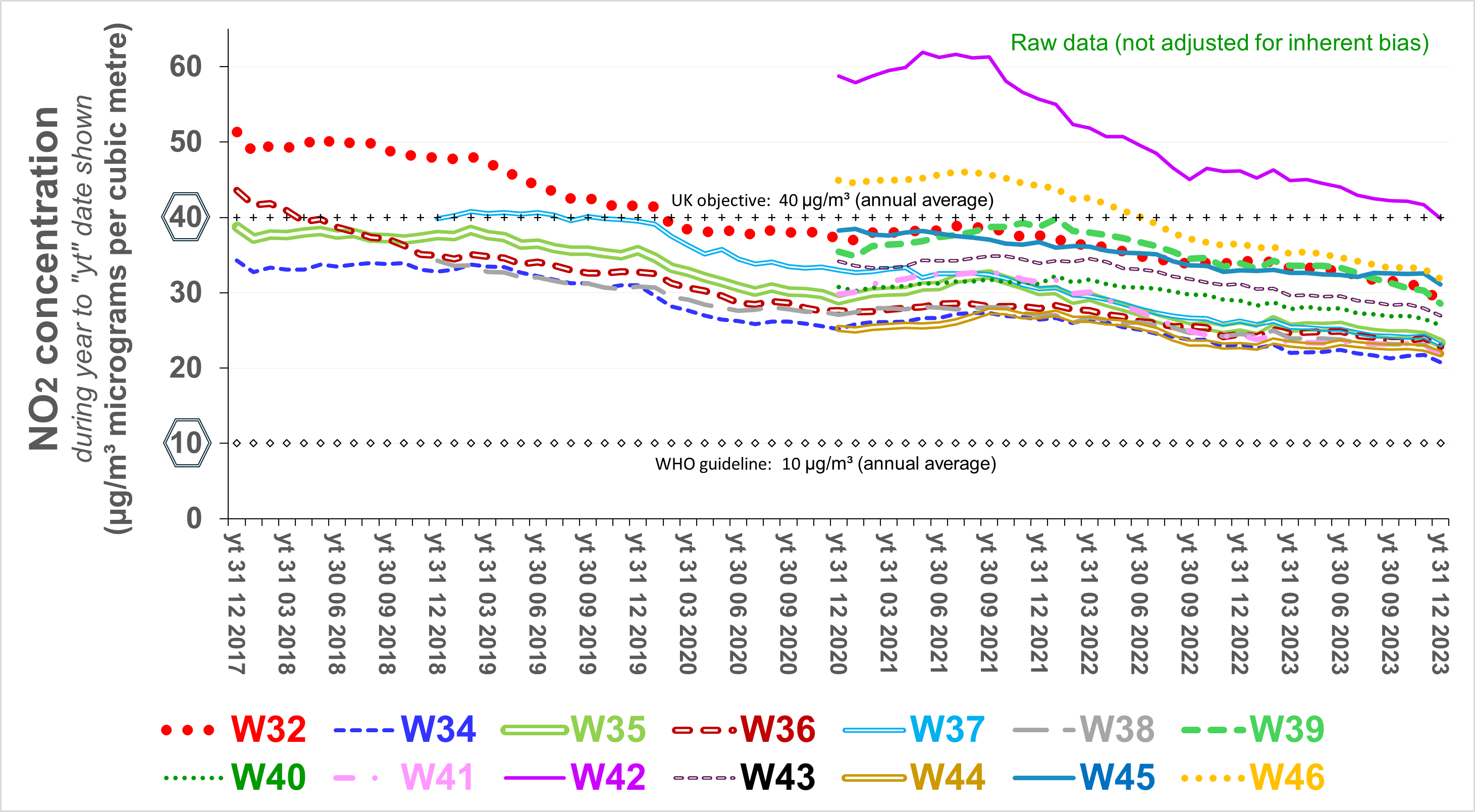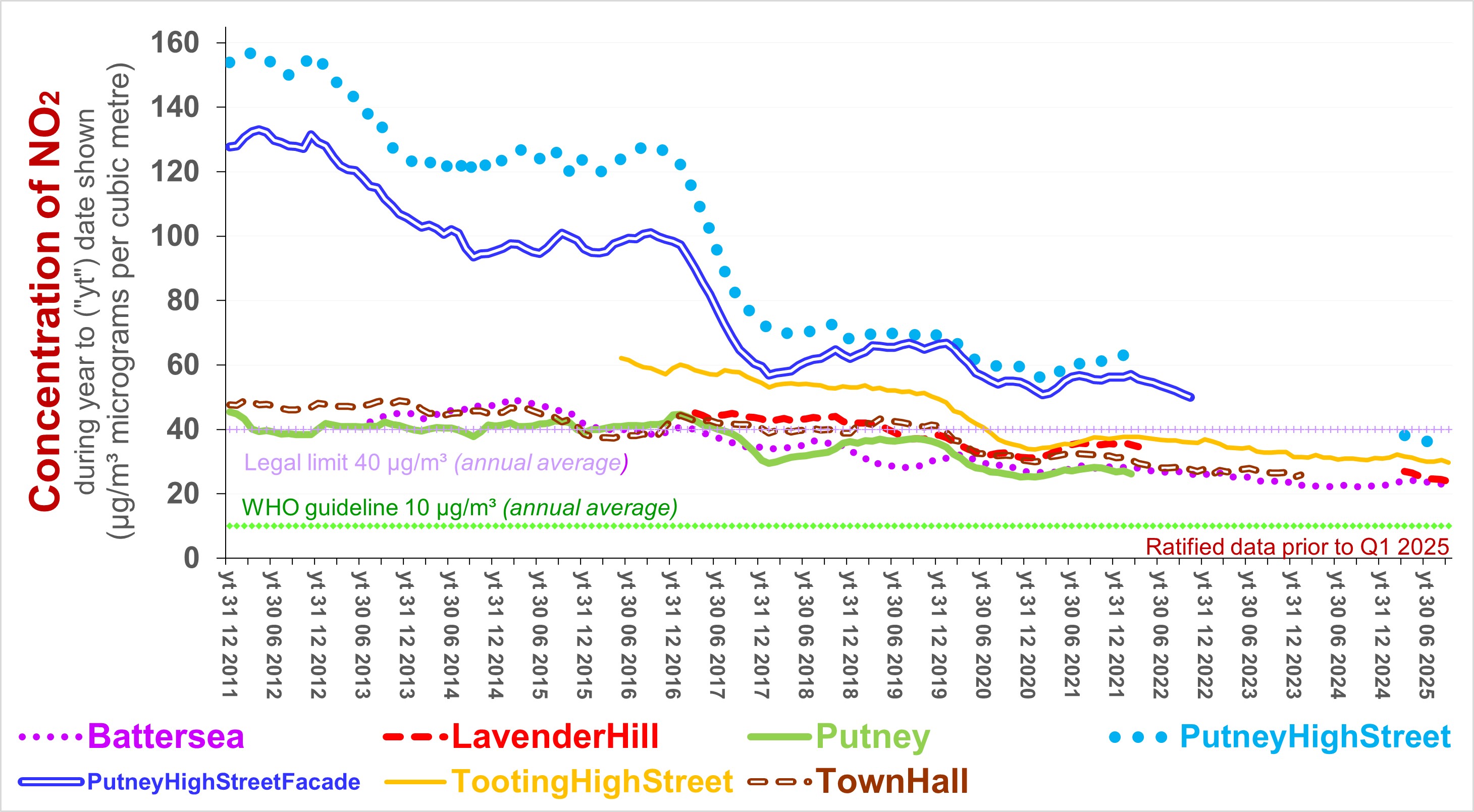 Air pollution measured by reference monitors (Necessarily, some of that data - from February 2025 - is provisional, subject to ratification. The difference between ratified and provisional data is unlikely to as much as 1% for particulate matter but might exceed 10% for NO2. Provisional NO2 data should therefore be considered with caution. The charts display the average of consecutive periods of 12 months - in order to smooth out seasonal fluctations (see chart below); and because government may regard such data as more significant that the extent to which data covering shorter time intervals. for example hourly or daily, exceed targets.)