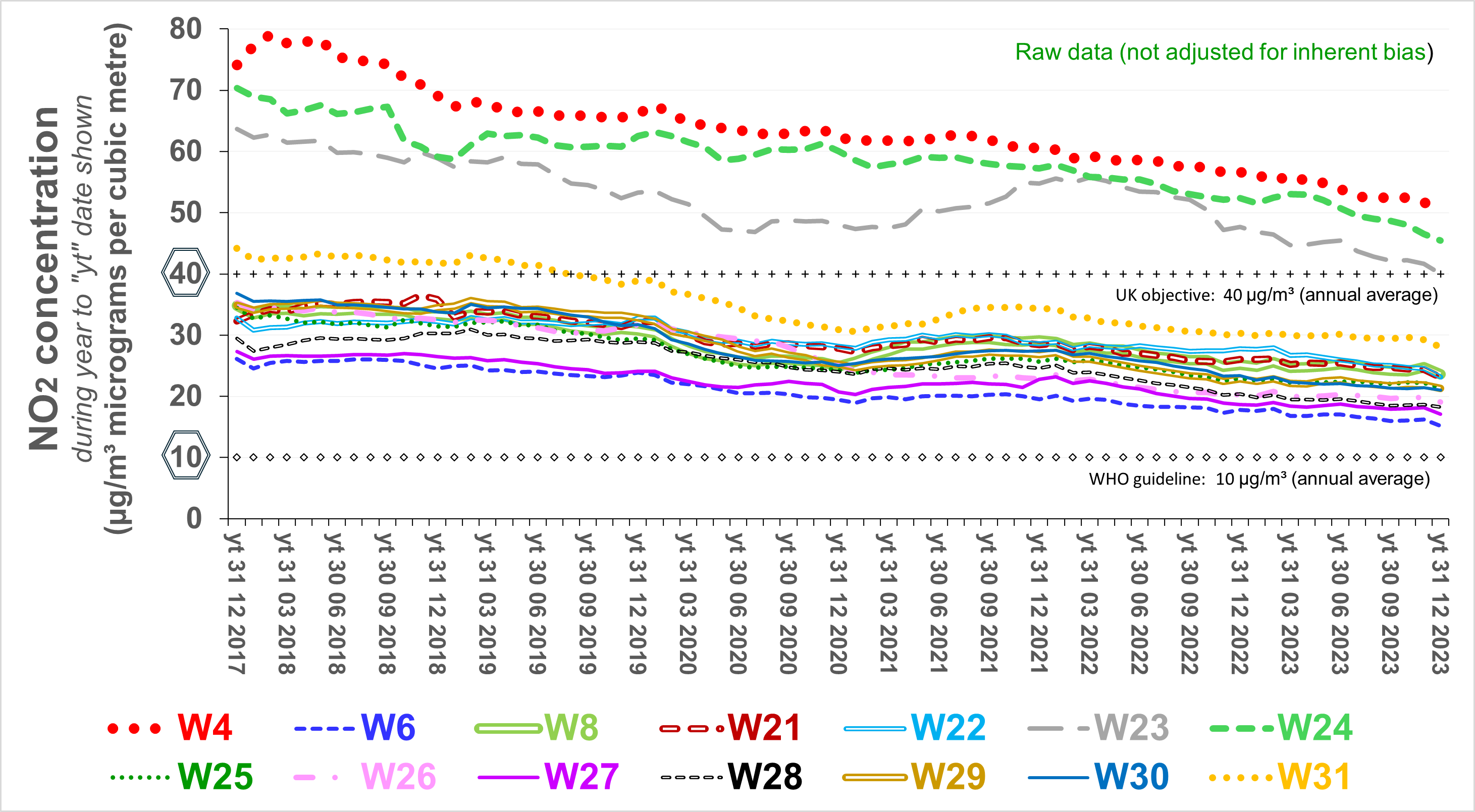 Diffusion tubes The uppermost chart maps annual averages for 2023. It illustrates the considerable difference in concentrations - attributble primarily to the flow of road traffic - between sites a short distance away from each other. The lower four charts indicate that, at the end of 2023, concentrations were similar to what they were during the first covid-19 lock-down and exceeded the UK objective at about four sites, namely: 256 Batterse Park Road, 50 Bickley Street, Putney High Street, and West Hill. Concentrations are lowest at the site in Battersea Park.