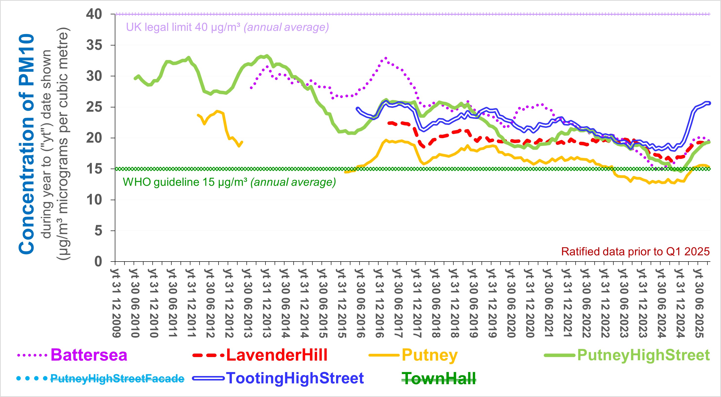 The primary source of the NO2 has tended to be the exhaust from diesel engines but also heating and cooking (by combustion, not only of fossil fuel). The improvement at the Putney High Street site during 2017 is attributable to tighter regulation, notably in relation to emissions from buses). The main local sources of particulate matter tend to be road traffic (tyres interacting with the road surface, breaks, and the resuspension of that dust cause by the motion of vehicles), construction (especially demolition), wood fires, and some cooking. Sources blown into the borough by the wind tend to contribute more to the concentration of particulate matter than NO2. Those sources include agriculture, industry, dust, and fire. Trends are likely to be influenced by the increasing frequency and severity of meteorological conditions (/the weather) attributable to the collapsing global climate. Concentrations of NO2 are currently within the UK target but more than double World Health Organisation ("WHO") guideline. For PM10, concentrations currently exceed the WHO guideline. Unlike WHO guidelines (revised in 2021), UK targets do not reflect the last couple of decades of peer reviewed research.