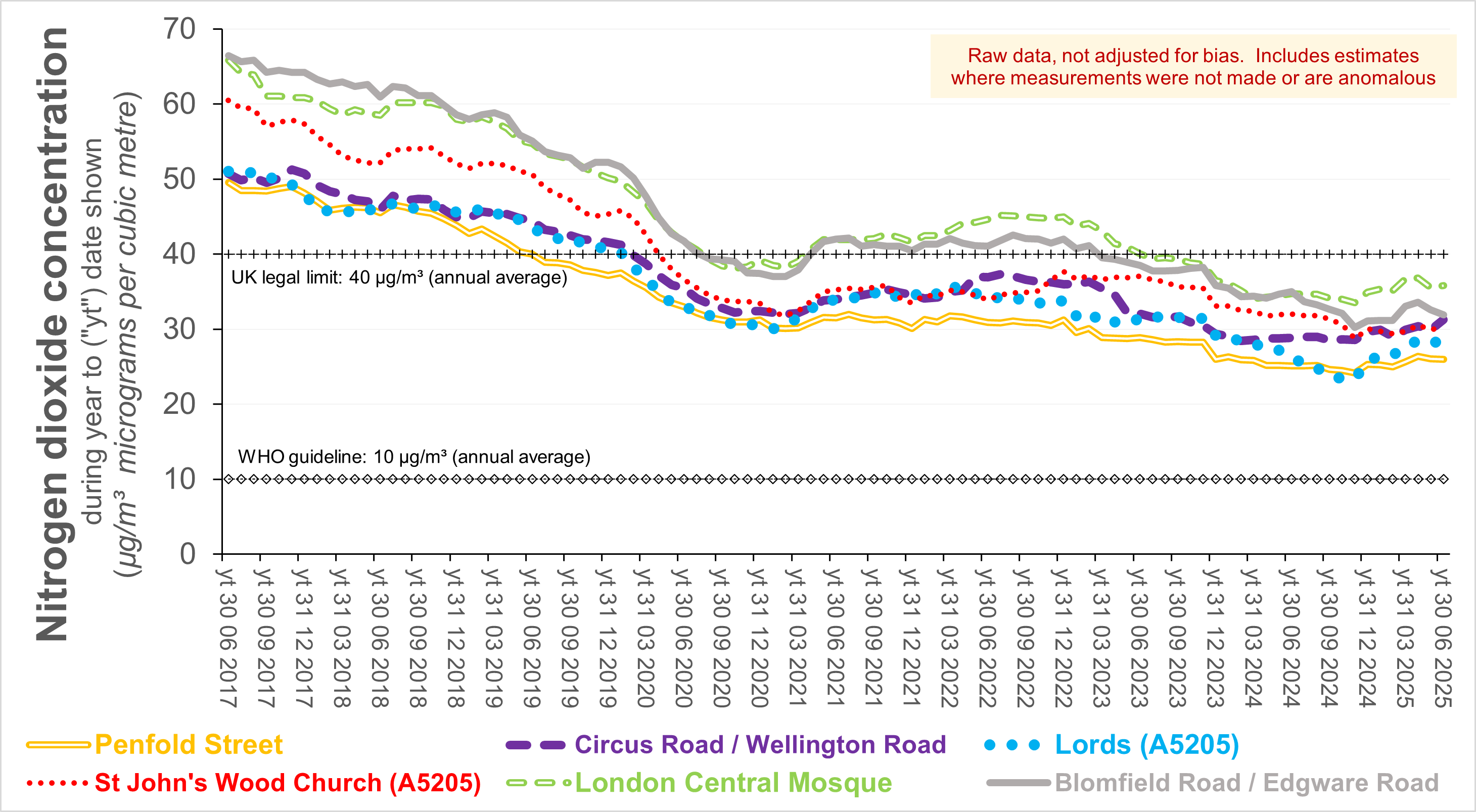 continuously for reference purposes: The steep reduction in NO2 pollution in the vicinity of Selfridges during 2015 and 2016 reflects the success of efforts to revise traffic flows and tighten regulations concerning emissions from buses, taxis and the like. The decrease in concentrations along the Marylebone Road is primarily attributable to the first phase of the ULEZ. Responses to the covid-19 pandemic explain the improvement between March 2020 and early 2021. The subsequent trend suggests that the relaxation of those responses has been matched by vehicle users anticipating the second phase of the ULEZ.